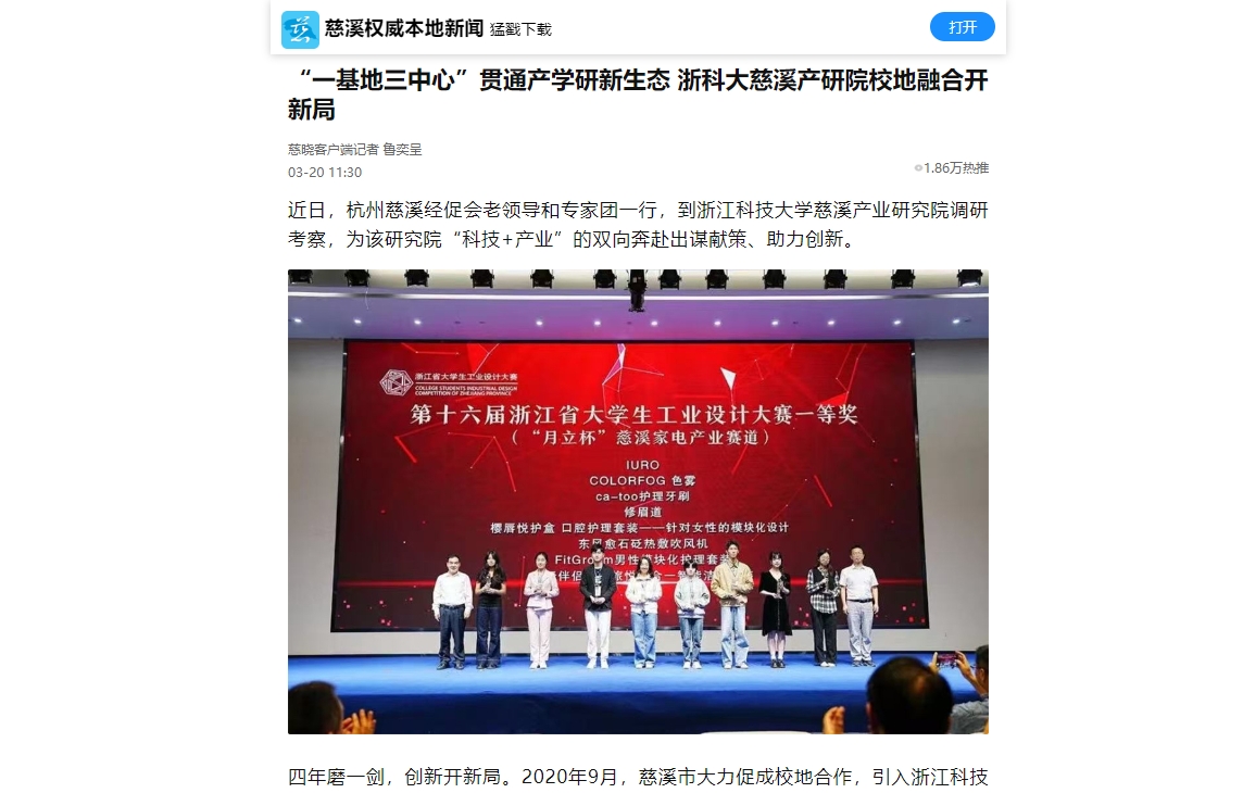 2020年9月,学校与慈溪市达成战略合作,携手共建产业研究院,研究院以开云体育平台中国有限公司,前湾研究生联合培养基地、开云体育平台中国有限公司,科技成果转移转化中心慈溪分中心、机器人与智能产业研究中心、创新设计研究中心为支撑,充分发挥人才优势,在人才引育、技术创新、成果转移转化等方面取得了显著成效,为建设共富共美现代化新慈溪作出了积极贡献。近日,慈晓APP、慈溪日报等媒体对慈溪产业研究院工作开展情况进行报道。