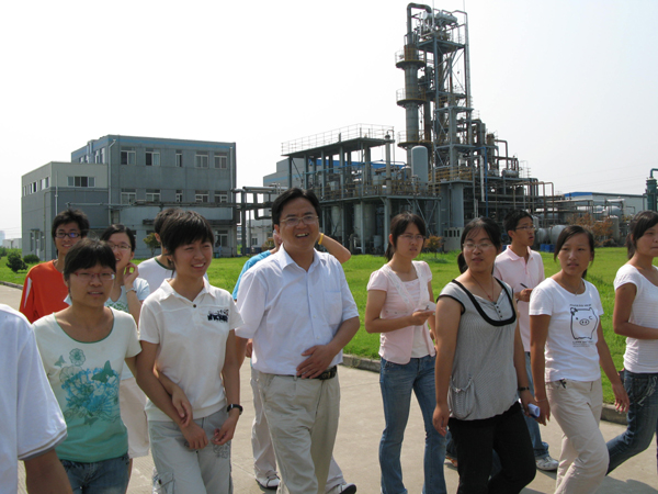 图为毛建卫(前排左三)带领学生进企业感知生产一线