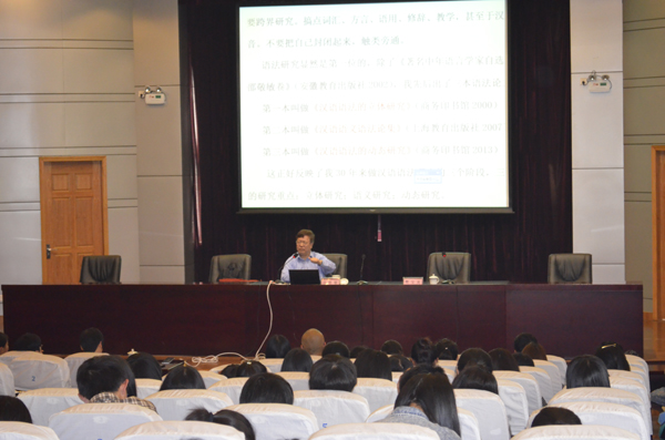 在题为“框式结构研究的理论与方法”的报告中,邵敬敏与在场200多位师生分享了近年来认知语言学理论的前沿成果——“框式结构”理论,列举了汉语中诸多超脱于词语、短语和句子的有趣构式,并进行较为系统、全面的分析和论证,展现这一理论对汉语语法学中一些老大难的问题的强大解释力。他还现身说法,结合自己的人生经历和学术轨迹,就青年人如何选择专业和职业,不断走向人生和事业的成功提出了自己的建议,并就学位论文的写作与大学生就业问题与在场学生进行热烈互动。邵敬敏平易近人、幽默风趣、学识渊博的大家风范赢得了在场师生的阵阵掌声。