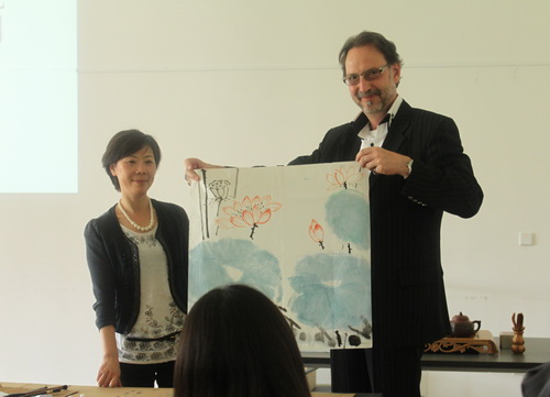 师生精选的节目富有民族特色,又有较高的文化水准,赢得了在场观众的喜爱。演出以杭州风光视频展示为始,向现场观众呈现了杭州的城市魅力。在《梁祝》的悠扬音乐中,两名学生向大家展示了中国传统民族服饰及舞蹈。师生们还为现场嘉宾表演了茶艺,并邀请观众共品香茗。书法表演和国画表演更是吸引了众多的年轻观众,大家纷纷围观,跃跃欲试。一名当地中学生在大家的鼓励下登台学艺,赢得了满堂喝彩。演出中,艺术学院老师还送上了了中国文化讲座《龙生九子》,向现场观众介绍了中国的龙文化。傣族独舞《孔雀归来》将演出带向高潮。艺术学院朱彦教授将她当场作的国画“荷韵”赠送给了埃尔福特应用科学大学孔子学院,德方院长瓦格纳教授向艺术学院赠送了孔子水晶塑像。