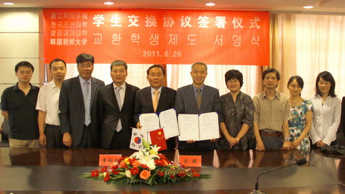 会谈中,朝鲜大学与我校就两校学生交换、学生实习及学生联合培养等内容进行深入洽谈,双方期待通过实质性合作项目建立进一步开拓两校在师生交流、学术合作等领域的交流合作。会后,双方签署了两校学生交换协议,计划每年派遣5名学生赴对方进行为期一学期或一年的交流。同时,为促进教育合作和人才培养,浙江科技学院、朝鲜大学、杭州韩商会经探讨协议,达成并签署了关于学生实习合作协议,根据协议,杭州韩商会将每年为我校提供20个学生实习名额。