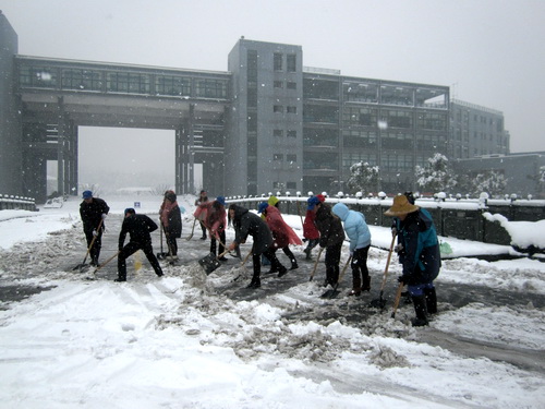 大雪给学校后勤保障工作带来了严峻考验。20日一早,10余名保卫干部及校卫队员冒雪提前赶至学校,从早上7点开始清扫学校正大门口及校内主要干道的积雪,力保校园道路交通顺畅。保卫处还通过手机短信平台向驾驶私家车上下班的教工发出温馨提示,注意雪天安全驾驶。