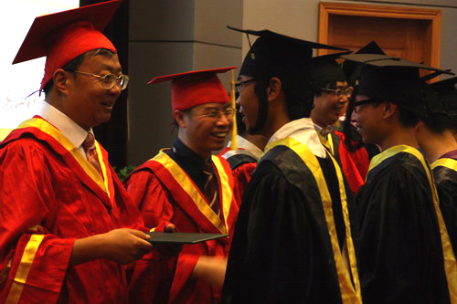 6月24、25日,毕业生学位授予仪式隆重举行。校长杜卫、副校长赵东福及校学位委员会成员与每一名获得学位的毕业生一一握手颁授学位。师长们为每位同学拨正学士帽上的流苏。杜卫还与每位毕业生合影留念。