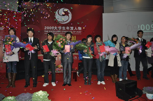 一首洋溢青春气息的诗朗诵《青春力量》拉开了颁奖典礼的序幕。随着“光电球”的闪烁,15位年度人物提名者分成5组依次走上领奖台。陈德宝、胡立钏、鲁佳、王俊桦、孙明团队、彭石军、孔徐娟、卢忠、杨轶辰、屠莉云获得2009年大学生十大年度人物称号,徐一嘉、高婕、夏思、方明伟、朱明县获得提名奖。获奖者讲述了自己背后与众不同的感人故事。机械学院陈德宝屡屡闯关,为我校首次夺得浙江省“挑战杯”特等奖;生化学院屠莉云带动20个团支部结对了天台南屏乡扶贫基地的20个贫困小学生,募捐了400多册图书;艺术学院孔徐娟独自扛起生活重担,她与母亲的浓浓深情催人泪下……大学生年度人物的事迹感动了在场的每一位观众,赢得了一阵又一阵热烈的掌声。