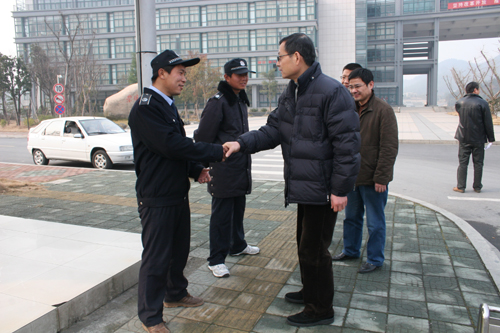 徐志平、陈根芳等还切看望和慰问了坚守在一线岗位上的校卫队员。他们仔细了解了校卫队员们的生活、家庭和工作状况,感谢他们为学校发展作出的贡献,并向他们致以新春的祝福。