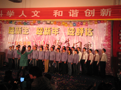 12月8日晚,小和山校区A4-122演讲厅内欢声笑语、暖意融融,伴随着时尚前卫、动感十足的街舞节拍,由生化学院举办的2006“迎新生 迎新年 迎评估”师生同乐大型联欢晚会拉开了帷幕。校党委副书记胡浙平、党委宣传部部长鲁维明、华丹公司韩总及校团委、理学院、中德学院、经管学院等部门、院系代表兴致勃勃地观看了演出。生化学院全体教师、全体新生和部分老生800余人参加了联欢晚会,得知消息的兄弟学院同学更是将A4-122挤得水泄不通。