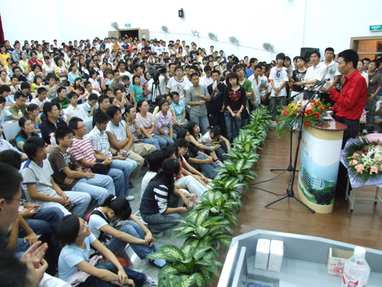 9月24日晚,我校小和山校区A4-122报告厅里灯光璀璨、气氛热烈,仅能容纳600人的报告厅里挤满了1000多位慕名而来的老师和同学,整个会场不但座无虚席,连讲台和通道也被大学生围得水泄不通,一场名为“与优秀企业家有约、在榜样的力量下感悟成长”的报告会正在这里举行。美特斯·邦威董事长兼周成建向大学生讲述了自己的创业经历,并和大学生面对面进行了交流,活动拉开了我校“握手企业家、引领新成长”优秀企业家进校园系列活动的序幕。校党委陈浩副书记主持了论坛第一讲。