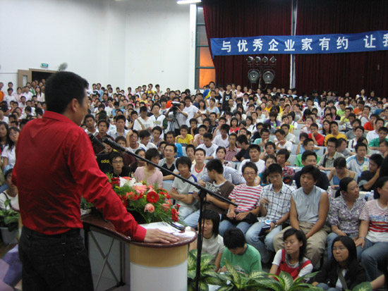 “其实,在我创业的过程中,也曾遇到过比服装业更有诱惑的行业,但我始终记得老师的一句话‘只要功夫深,铁棒磨成针’,所以才走到了今天。”周成建结合自己从一位普通农村小伙子成长为一位优秀企业家的艰苦历程及心得体会同大学生们进行了面对面的交流。他说,每个人都有不同方式的成功,有的同学以成绩好为成功,有的同学以体育好为成功,还有些同学认为交际广泛、人缘好就是成功。正因为如此,我们更要端正自己对待成功的心态。对自己要有充分的自信,做事情要充满激情,学知识要不断地更新、延续。只有这样才能享受持续性的成功感觉。