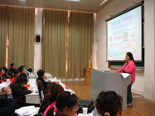 供职于杭州志愿者培训中心的香港义工桑吕敏妮特邀作了专题讲座。桑吕敏妮首先介绍了香港志愿服务事业的发展历程,香港义务工作概况,讲述了自己从十几岁开始走上志愿服务道路的经历和感受。在场的200多位听众都被她这种至真至诚的奉献精神所感染,掌声四起,同学们纷纷立志要当一名志愿者,为构建和谐社会奉献爱心和智慧。