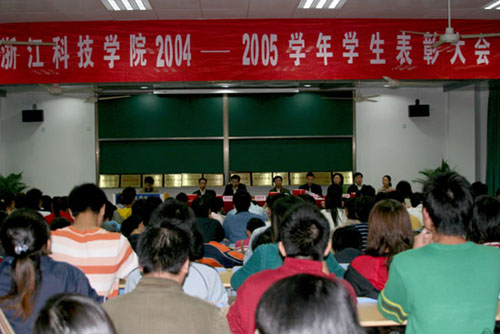 | 11月11日下午,浙江科技学院2004-2005学年学生表彰大会在小和山校区举行。校党委副书记胡浙平,校党委委员、副院长龚建立,校党委宣传部长、统战部长鲁维明,校学工部部长、学生处处长陈跃泉,校团委副书记郑友取等出席了表彰会。各二级学院学生代表260余人参加了大会,整个会场座无虚席,过道上也站满了自愿来参加的同学。 表彰大会在庄严的国歌声中开始。校党委委员、副院长龚建立宣读了《浙江科技学院关于表彰2004-2005学年学校特优学风班、优良学风班的决定》和《浙江科技学院关于表彰2004-2005学年三好学生和奖学金获得者的决定》。校团委副书记郑友取宣读了《共青团浙江科技学院委员会关于表彰2005学年校暑期社会实践优秀团队、优秀指导老师、先进个人及优秀论文的决定》。三好学生、一等奖学金获得者2003级信息学院计算机专业盛珊珊同学代表所有获奖学生发言,谈了自己学习的体会,表达了对学校和老师教育的感激之情。校党委副书记胡浙平发表了讲话。他首先对获奖集体和个人表示祝贺,向培养同学们成长的老师表示感谢。胡副书记在总结获奖同学先进性表现的共性时说:一是重学习;二是重进步;三是重创新;四是重集体荣誉。最后,他在讲话中对同学们提出了几点希望:一要正确对待先进荣誉;二要追求全面进步;三要狠抓学风建设,把学习作为学生的第一要务。