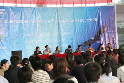 每年一届的全省大学生结构设计竞赛,是由浙江省大学生科技竞赛委员会主办的面向我省大学生的主要学科竞赛之一,旨在开拓大学生的创新思维和提高实际动手能力,培养团队精神,增强大学生的工程结构设计和实践能力,浓郁校园学术氛围,促进各高校间的相互交流和学习。自2002年起至今已经成功举办了三届,本届比赛的题目是“桥梁模型的制作”,分为“单跨”或“双跨”两种形式,由参赛选手自由选择,制作材料为2毫米厚的有机玻璃、氯仿黏合剂。竞赛的考核指标分为“单位质量的承载力”和“最大挠度”两项。浙江中浩检测工程有限公司赞助了本届比赛。